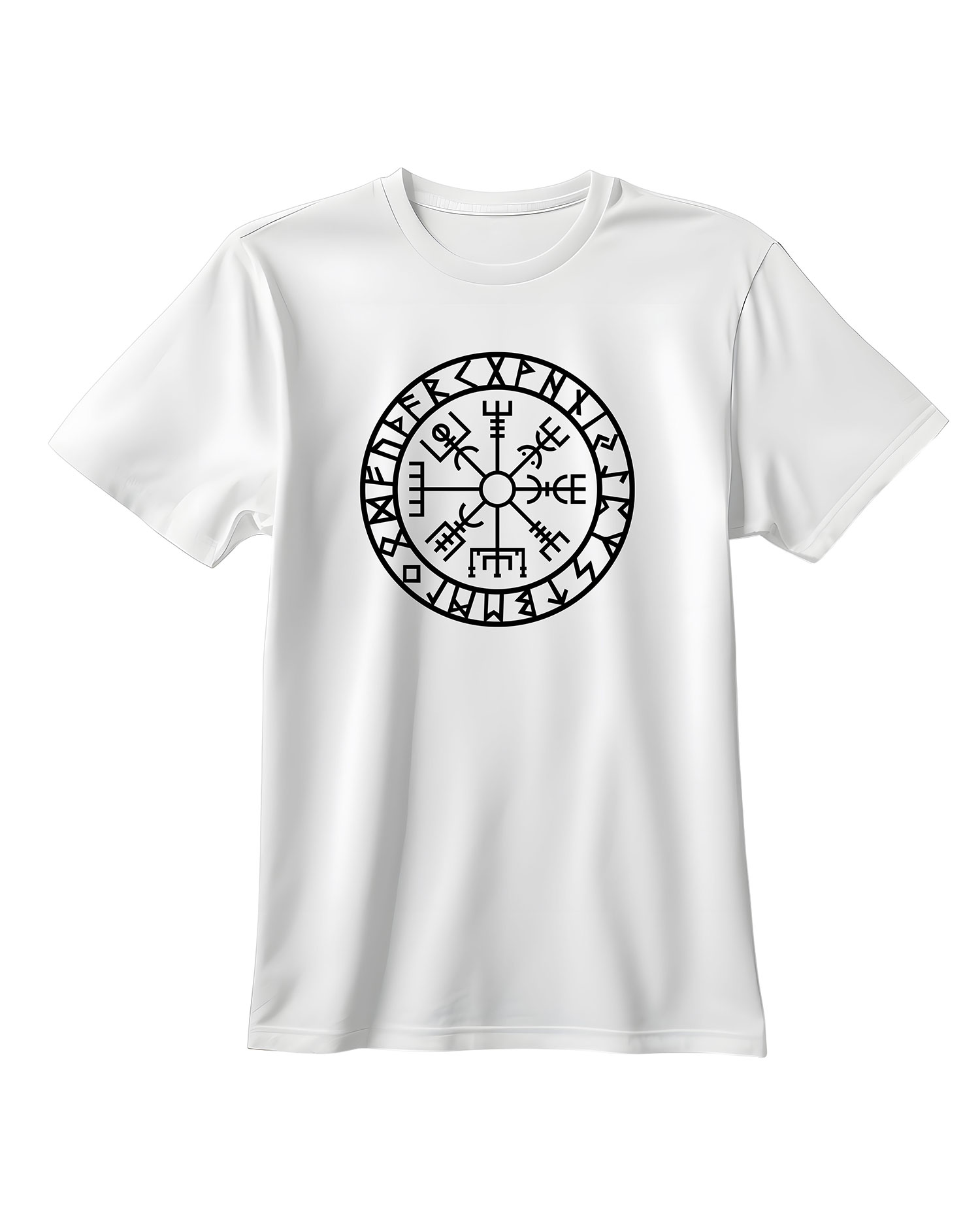 Dieses T-Shirt macht dich zum Träger genau dieser uralten Magie. Der Vegvisir ist nicht einfach nur aufgedruckt – er ist mit höchster Präzision und in intensiver Tiefenschärfe gestaltet, sodass jede Rune, jeder Kreis und jede Linie wie von einem isländischen Runenmeister selbst eingraviert wirkt. Das Motiv strahlt in mystischem Altweiß und dezentem Silber-Grau auf tiefschwarzem Stoff und scheint bei bestimmten Lichtverhältnissen leicht zu glühen – als würde der Kompass tatsächlich seine Kraft entfalten.